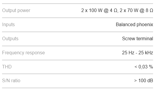A 100 is 2-channel power amplifier with 100 W rated power per channel at 4 Ω. With screw terminal speaker connectors and balanced Phoenix input connectors. The amplifier has an ultra-slim body, a fan cooling system, and a bridge mode selector.