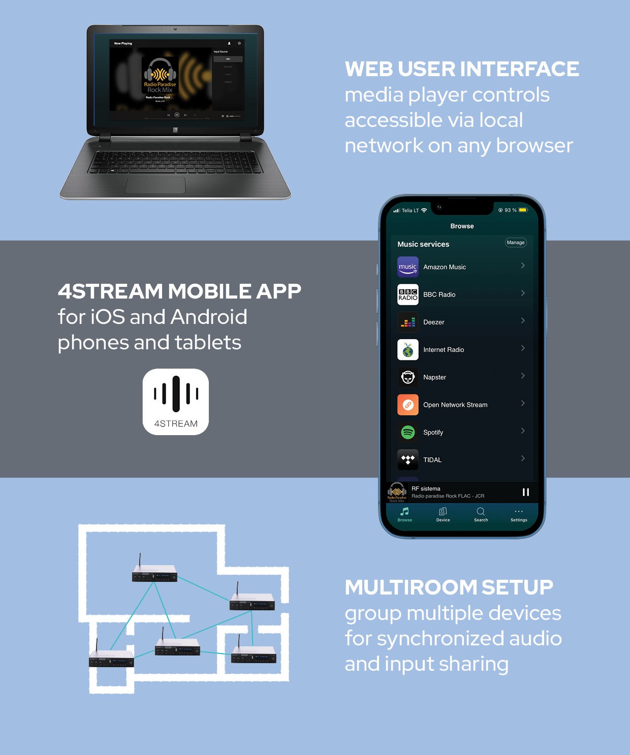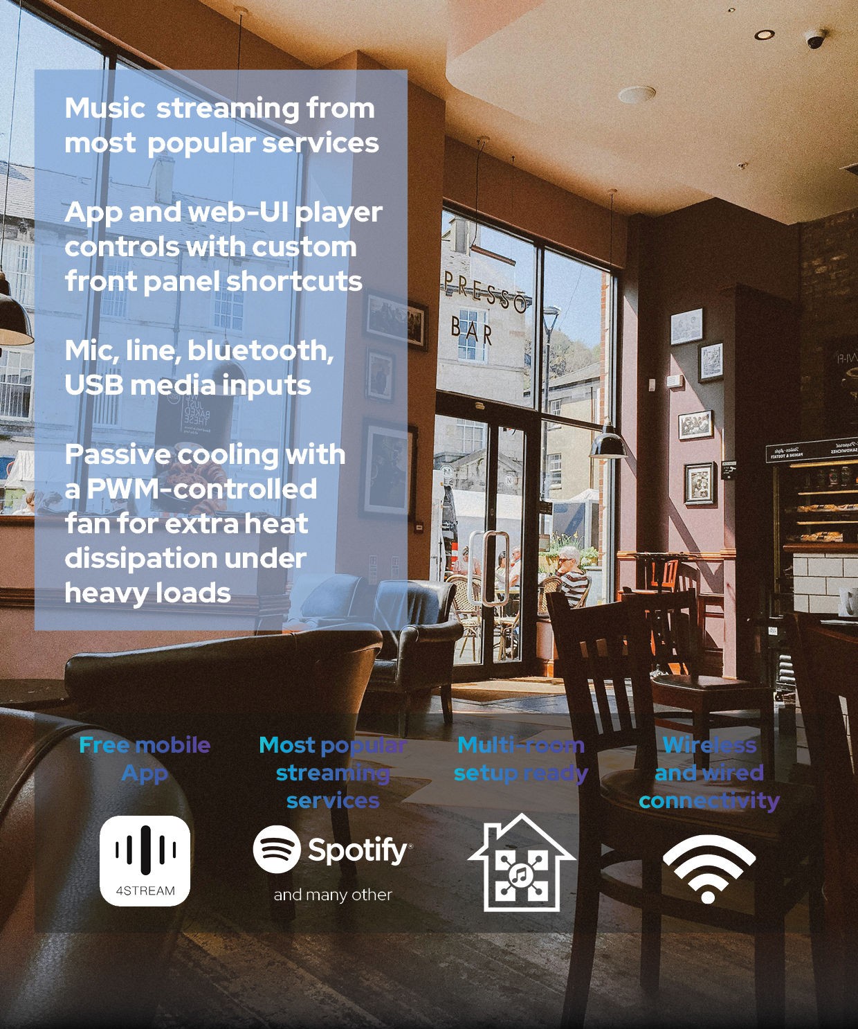 This music streamer is ideal for multi-room applications, allowing to divide the audio system into separate zones or combine them into one large system. When multiple DMPA STREAM amplifiers are installed within a building and connected to the same Ethernet network, they can work seamlessly together to create a unified audio system.