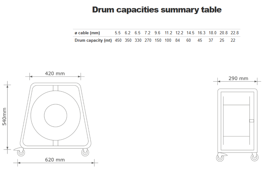 Deze kabelhaspel is gebruiksvriendelijk en geschikt voor vele toepassingen. Hij is met name geschikt voor de realisatie van multicore distributiesystemen. De perimetrische structuur clustert de haspel volledig. Het zeer sterke frame, gemaakt van gebogen en gesoldeerd constructiestaal, voorkomt onbedoelde mechanische schade en is matzwart gepoedercoat. De binnendiameter van de rol maakt het gemakkelijk om zowel dikke kabels als delicatere video- en glasvezelkabels op te winden en terug te winden. De centrale as van de stalen rol is aan één kant bevestigd via een spindel die is bevestigd aan een stalen kast van 40 mm, terwijl de andere kant vrij is. Deze kant van de haspel heeft een grote opening waar een optionele snelkoppelingsplaat kan worden geplaatst om de kabeluiteinden op te bergen. Als alternatief kan aan de open kant een geboorde plaat met 16, 24 of 32 gaten voor XLR-montage worden gemonteerd om een draaibare stagebox te verkrijgen. De slinger bevindt zich aan dezelfde kant, terwijl aan de andere kant een wrijvingsregelbare rem is voorzien om de rotatie van de rol tijdens transport te stoppen. De kabelhaspel heeft vier wielen (waarvan twee met rem) voor gemakkelijker verplaatsen.