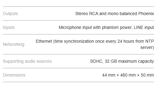 De wekelijkse speler is ontworpen om audiobestanden af te spelen volgens een schema dat is opgeslagen op een SD-kaart. Hij kan ook achtergrondmuziek afspelen tussen geplande audioberichten. Microfooningang met prioriteit en fantoomvoeding. Met externe bediening om audioberichten op afstand te activeren via acht droge contacten. De vooraf opgenomen berichten kunnen worden teruggeroepen met de vier speciale knoppen aan de voorzijde. De wekelijkse speler kan worden gesynchroniseerd met internet-NTP-servers.