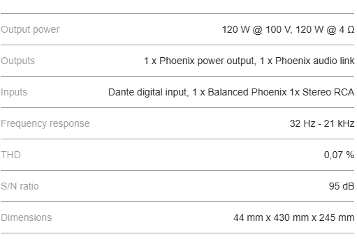 Enkelkanaals klasse-D versterker met een uitgangsvermogen van 120 W. Ontworpen voor hoogwaardige achtergrondmuzieksystemen met 100 V en lage impedantie. Met stille ventilatormodus en DSP-verwerking, inclusief een 6-punts parametrische EQ, limiter, gate en delay. Uitgerust met een Dante digitale ingangskaart, gebalanceerde Phoenix- en stereo RCA-ingangen en een audiolinkuitgang. De versterker beschikt over een RS232-besturingspoort voor integratie met besturingssystemen van derden, waardoor iAC-versterkers kunnen worden gebruikt in grote en complexe audio-installaties die geautomatiseerd en op afstand bediend kunnen worden.