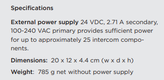 - De externe voeding (24 VDC, 2,71 A secundair, 100-240 VAC primair) levert voldoende stroom voor maximaal circa 25 intercomcomponenten.