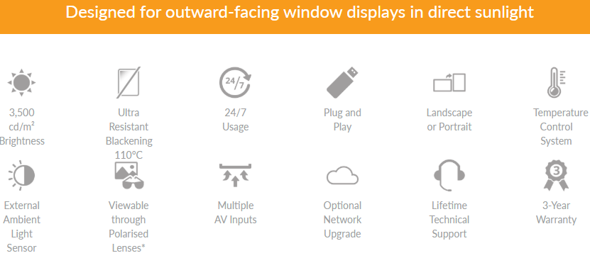 Deze displays zijn ontworpen voor etalages en beschikken over commerciële, ultraheldere panelen (3500 cd/m²) die tot 10 keer helderder zijn dan huishoudelijke televisies. Hierdoor springt de inhoud er echt uit, zelfs in het felste directe zonlicht.