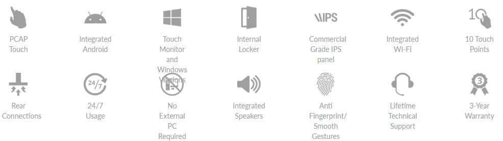 Dit alles-in-één interactieve scherm combineert het beste van PCAP-touchscreentechnologie met een stijlvolle en veilige kiosk. Het scherm lijkt op een gigantische tablet met een randloos gehard glazen front en een aluminium rand. Ontworpen voor commerciële toepassingen, zorgt het gebruiksvriendelijke, ergonomische ontwerp ervoor dat gebruikers perfect met het scherm kunnen interageren. Het opvallende ontwerp, samen met de geïntegreerde Android-mediaspeler, onderscheidt deze oplossing van andere touchscreens op de markt, zowel qua functionaliteit als qua esthetiek.
