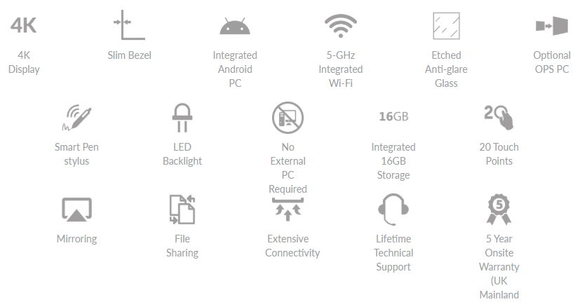 Het 4K Ultra HD-display levert een ongelooflijke beeldkwaliteit met een resolutie die vier keer hoger is dan Full HD. Geoptimaliseerd voor kijkafstanden van dichtbij en veraf, zorgt het display ervoor dat uw content centraal staat in al uw visuele communicatie.