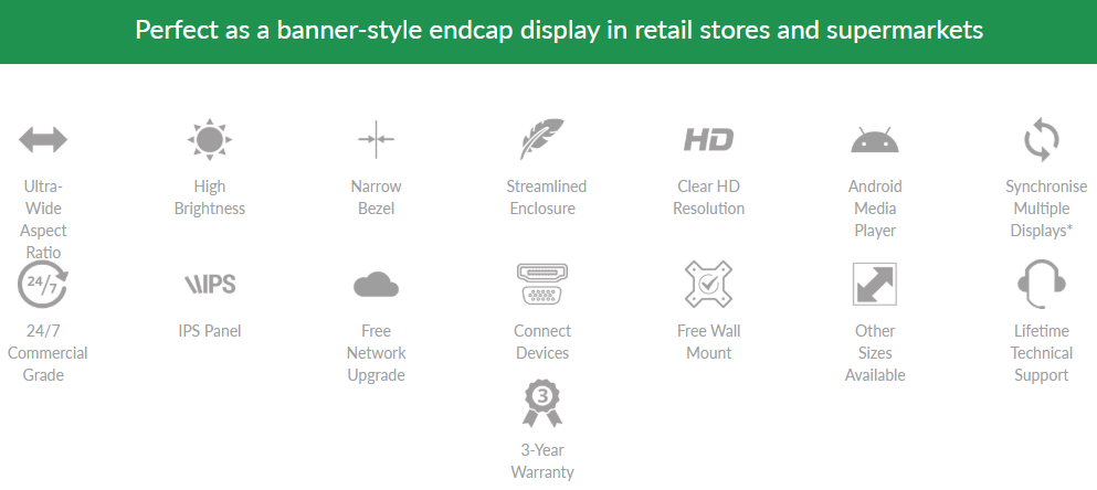 Of het nu wordt gebruikt als onderdeel van een display aan het einde van een gangpad of als een uniek, individueel scherm, deze oplossing biedt een veelzijdig scala aan toepassingsmogelijkheden. De flexibiliteit van gebruik in portret- of landschapsmodus en de ultrabrede beeldverhouding maken ze de perfecte aanvulling op onze LCD-displays voor aan de rand van het schap.