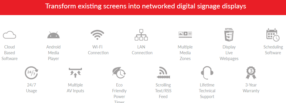 Als u al een scherm hebt, maar dit wilt omzetten in een digitaal signage-scherm dat is gekoppeld aan een netwerk, bieden deze mediaspelers een kosteneffectieve en probleemloze oplossing.
