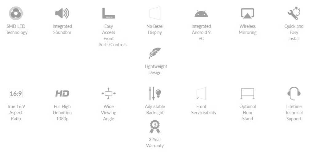 Versatile giant all-in-one direct view LED screen. Integrated Android and speakers create a big impact.